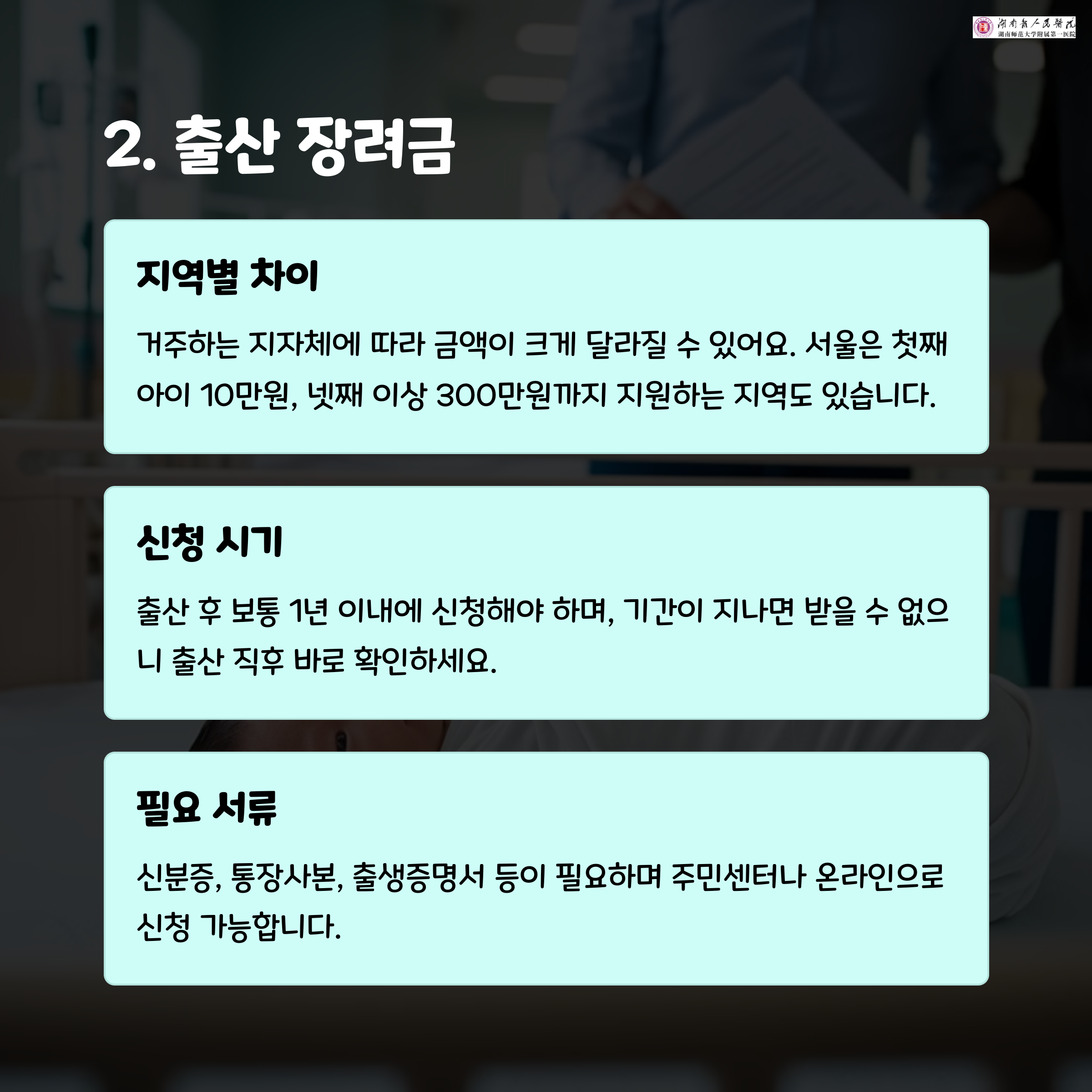 출산 장려금은 정부가 출산을 장려하기 위해 제공하는 지원금입니다. 이 지원금은 아이가 태어날 때마다 지급되며, 금액은 거주 지역과 부모의 소득 등에 따라 달라질 수 있습니다. 다만, 지원금을 신청하지 않으면 지급되지 않으므로, 출산 후 반드시 확인하고 신청해야 합니다.