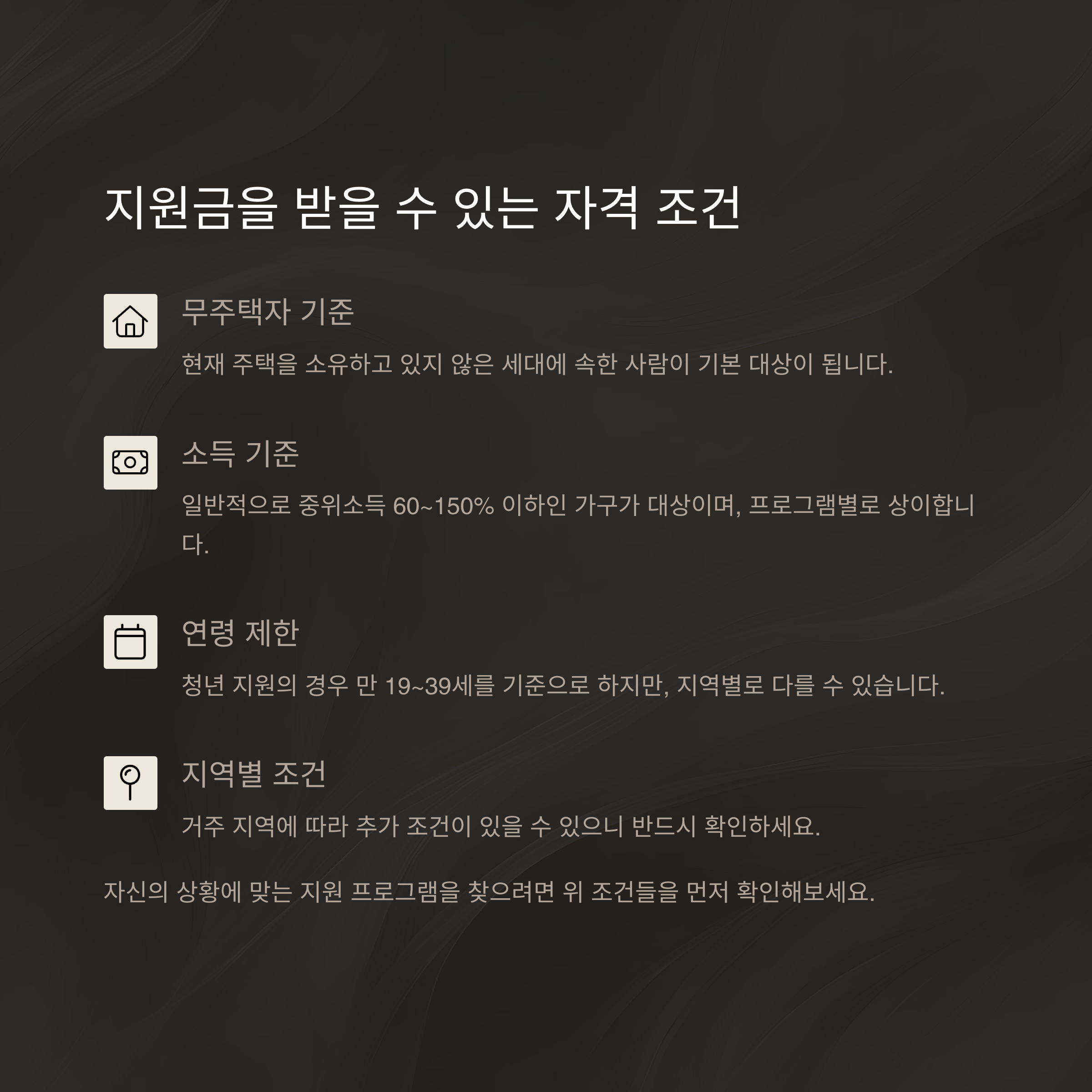 | 월세 보조금 | 매월 일정 금액의 월세를 보조받는 형태 | 소득 요건 필수 |