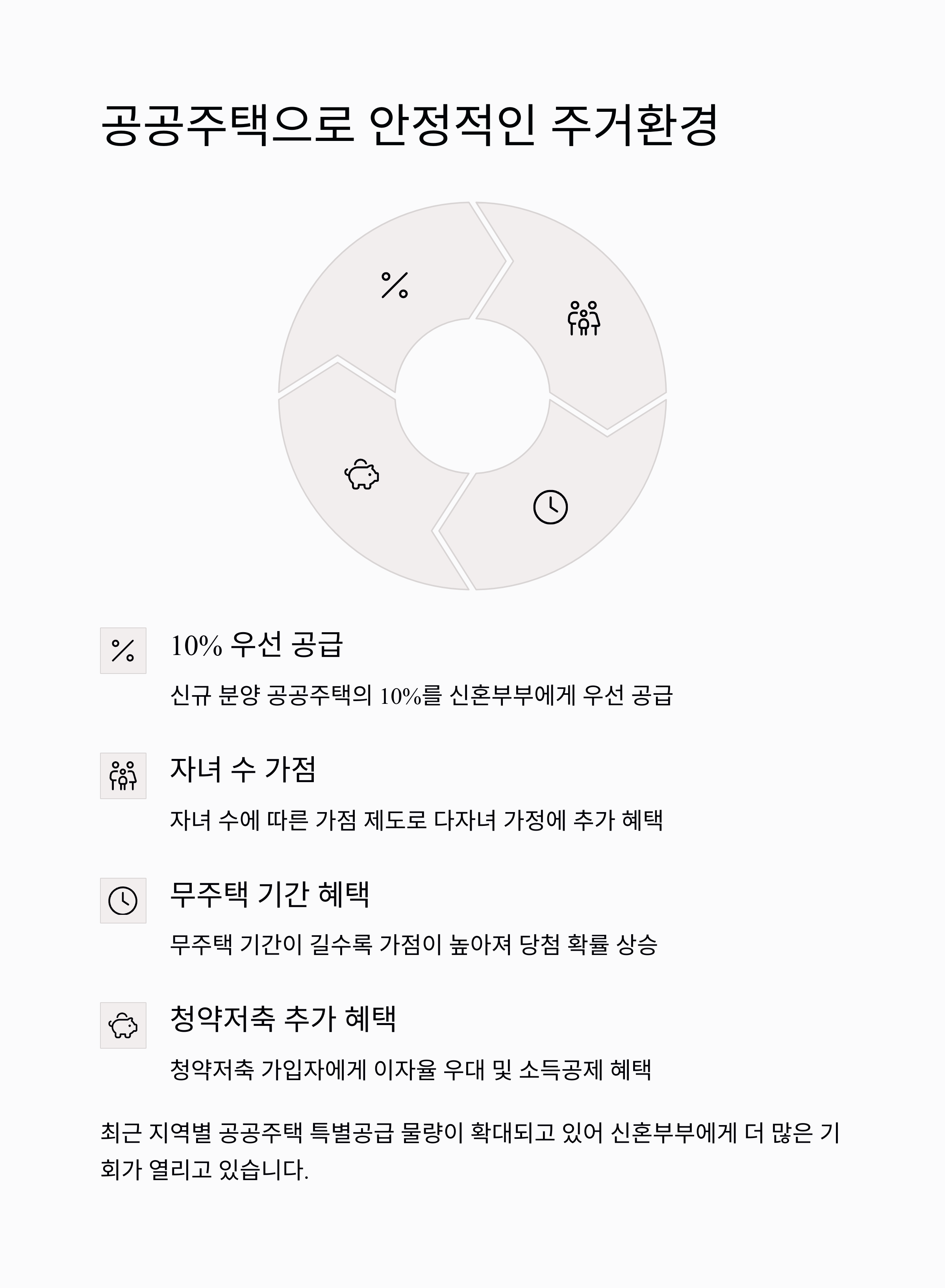 오늘은 신혼부부를 위한 주택 지원 제도에 대해 대출부터 보조금, 공공주택 우선공급까지 꼼꼼히 정리해보았습니다. 내 집 마련이라는 큰 꿈을 꾸는 만큼, 정부의 다양한 지원을 충분히 활용한다면 조금 더 수월하게 시작할 수 있습니다. 각 제도마다 신청 자격과 조건이 다르기 때문에 본인의 상황에 맞춰 전략적으로 접근하시는 것이 중요해요. 특히 온라인에서 간단히 확인 가능한 자격 시뮬레이터도 적극적으로 활용해보시길 권장드립니다. 앞으로도 도움이 되는 정보로 여러분의 내 집 마련 여정을 응원할게요.